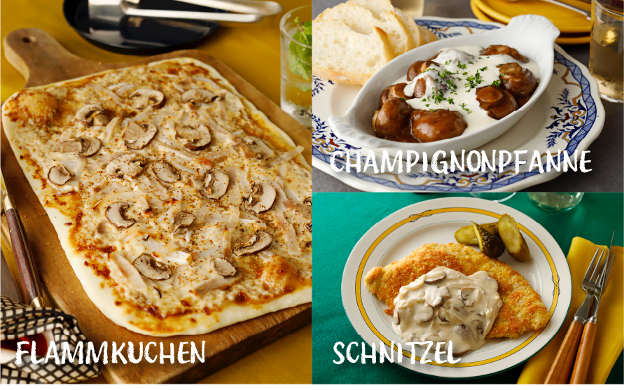 今回の料理教室では、ドイツ料理でマッシュルームを使った3品「フラムクーヘン(ドイツ風薄焼きピザ)」「シャンピニオン・プファンネ(マッシュルーム炒め)」「きのこソースのシュニッツェル」を教えて頂きました。